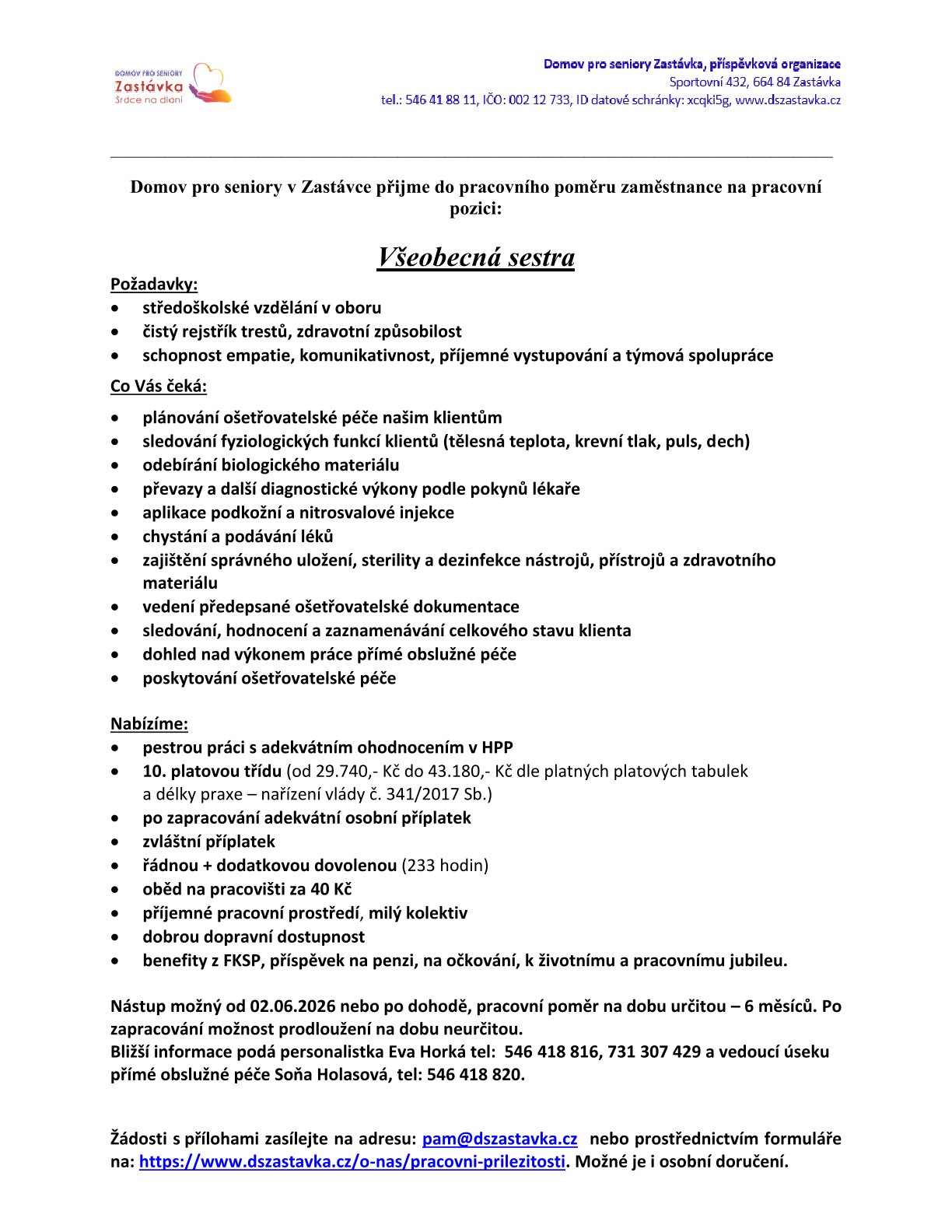 Domov pro seniory v Zastávce přijme do pracovního poměru zaměstnance na pracovní pozici: