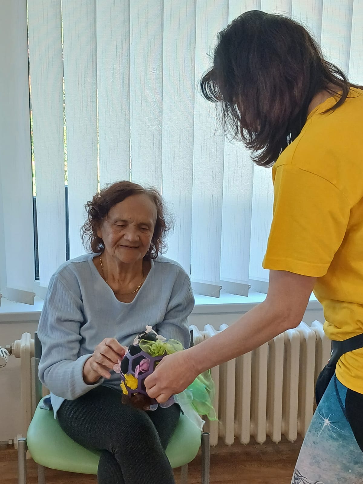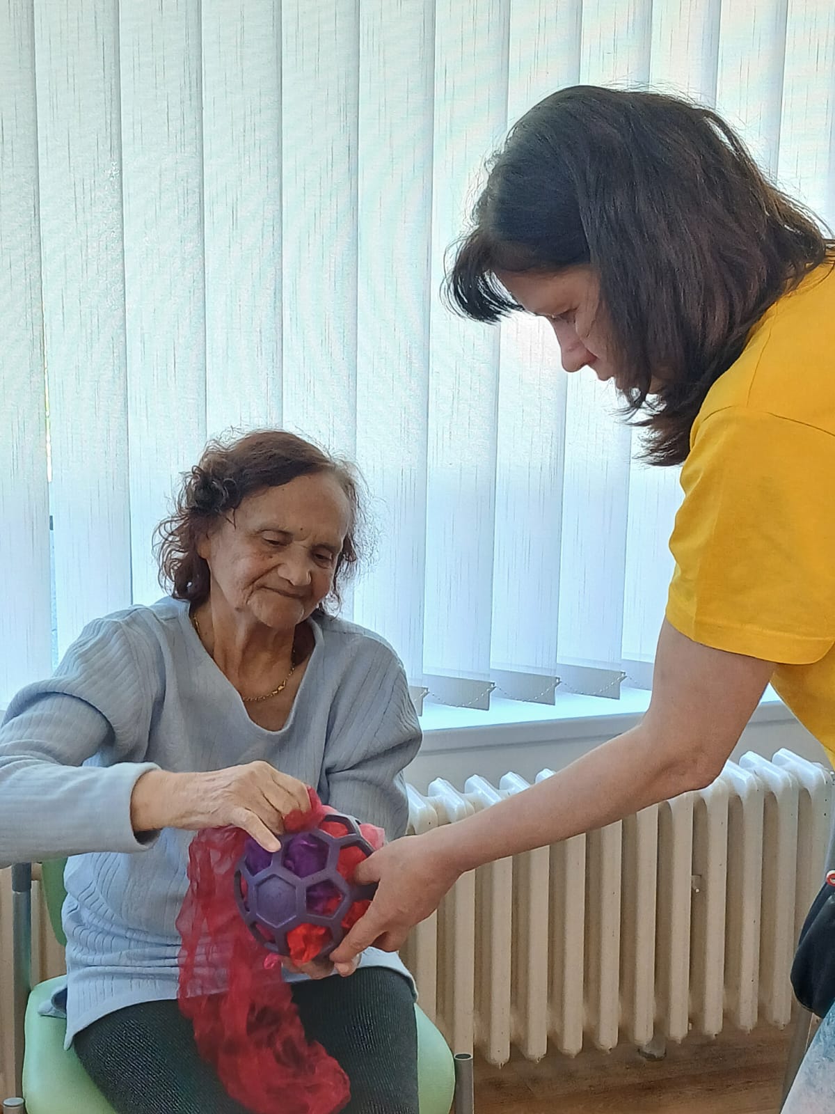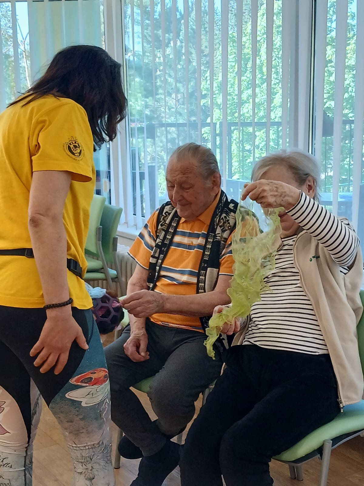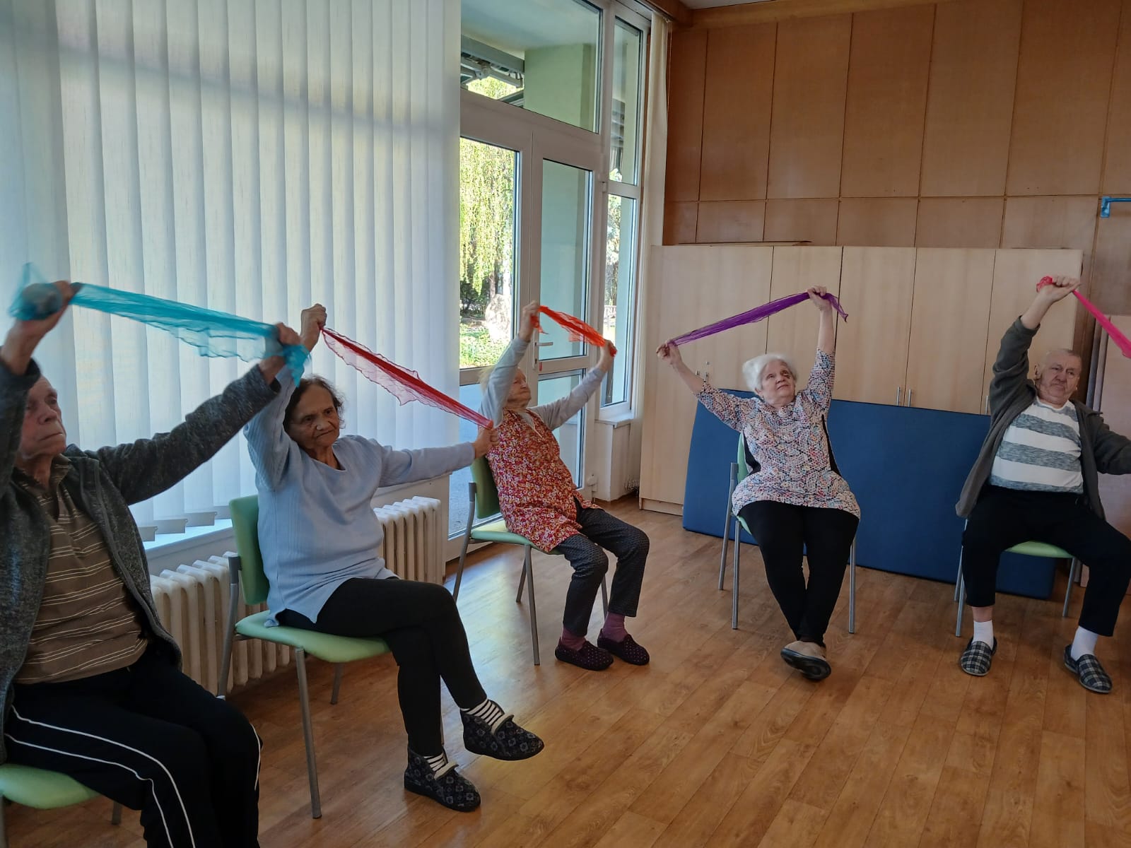 Nechyběla ani jednoduchá pohybová část se šátky, při které si klienti protáhli horní končetiny a zapojili se dle svých možností.