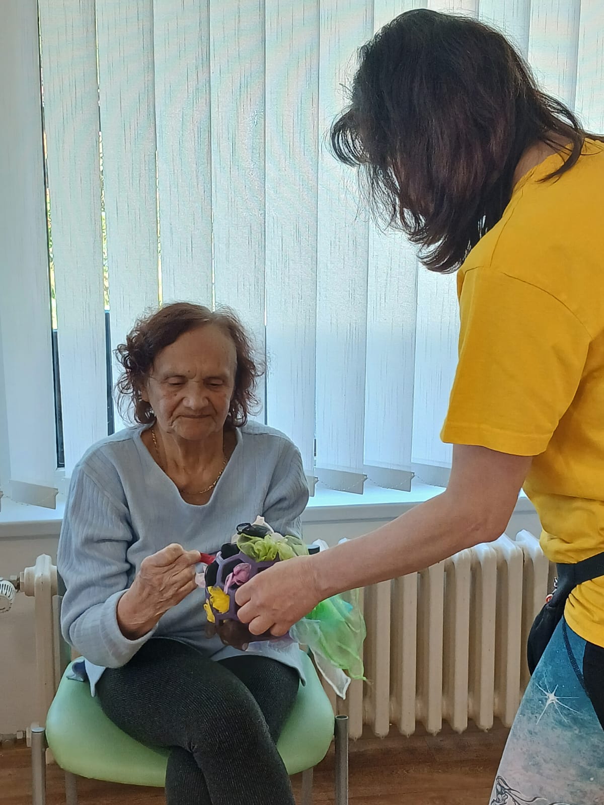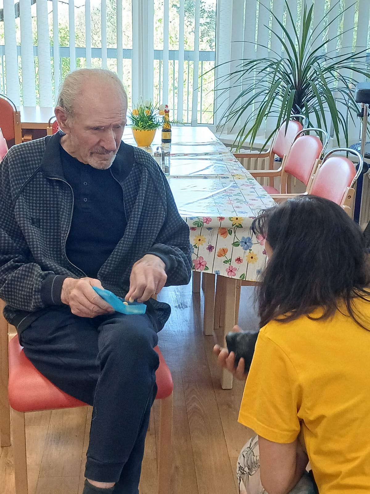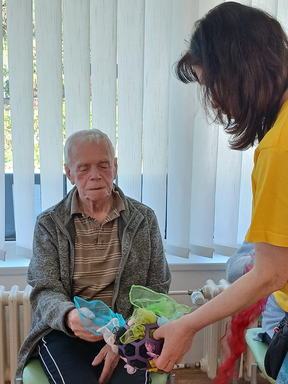 Součástí setkání byla také smyslová aktivizace, při které klienti pracovali s různými pomůckami a materiály. Zapojovali jemnou motoriku, procvičovali úchop a vnímali různé struktury.