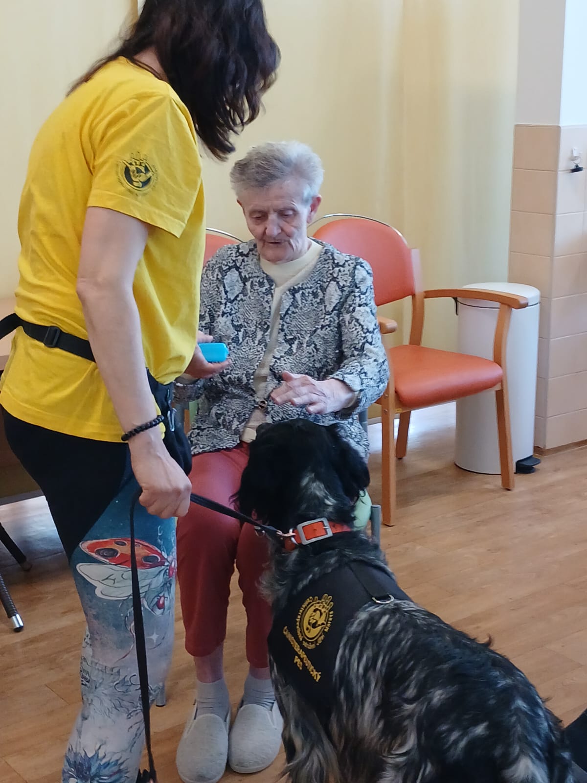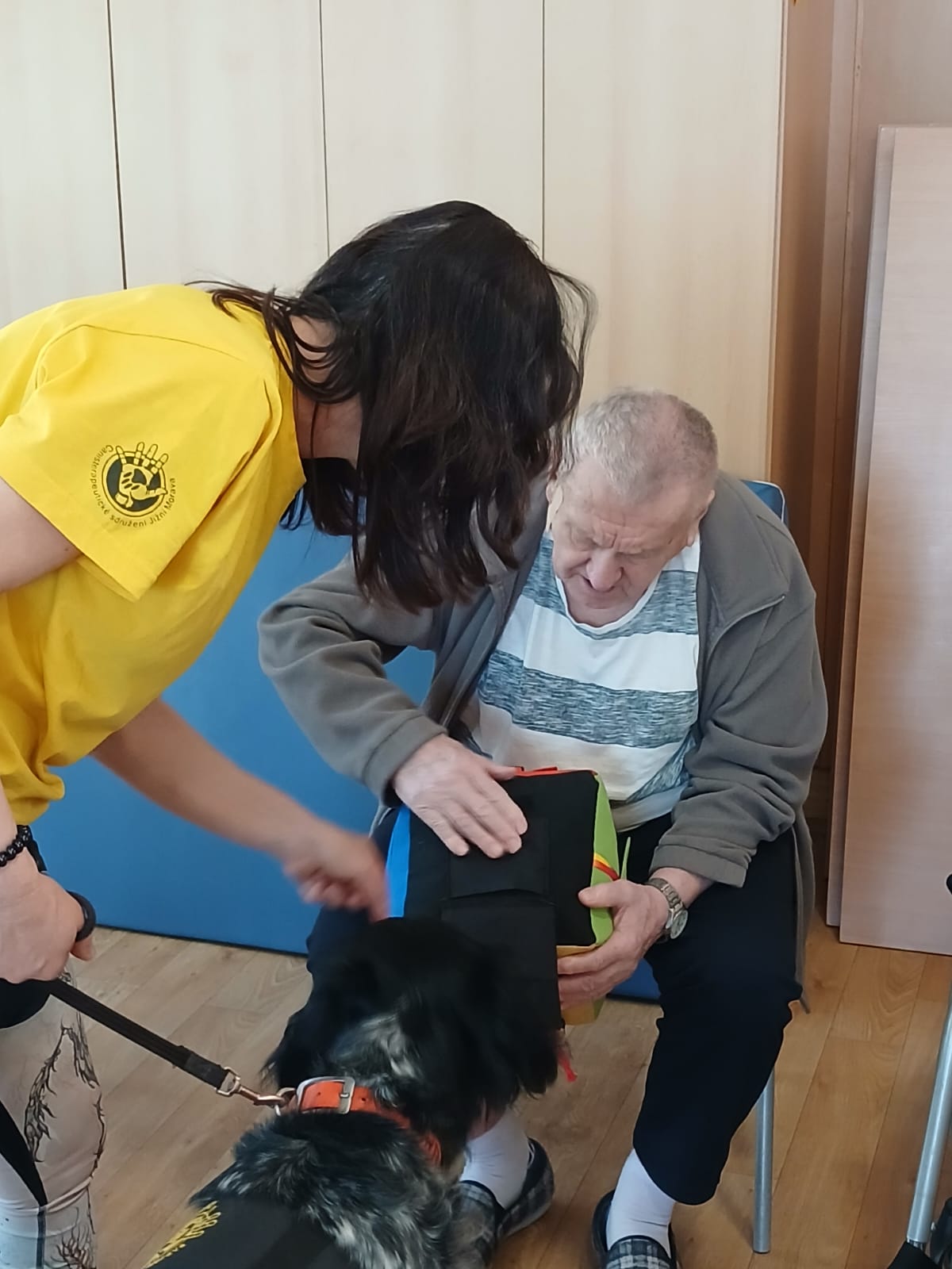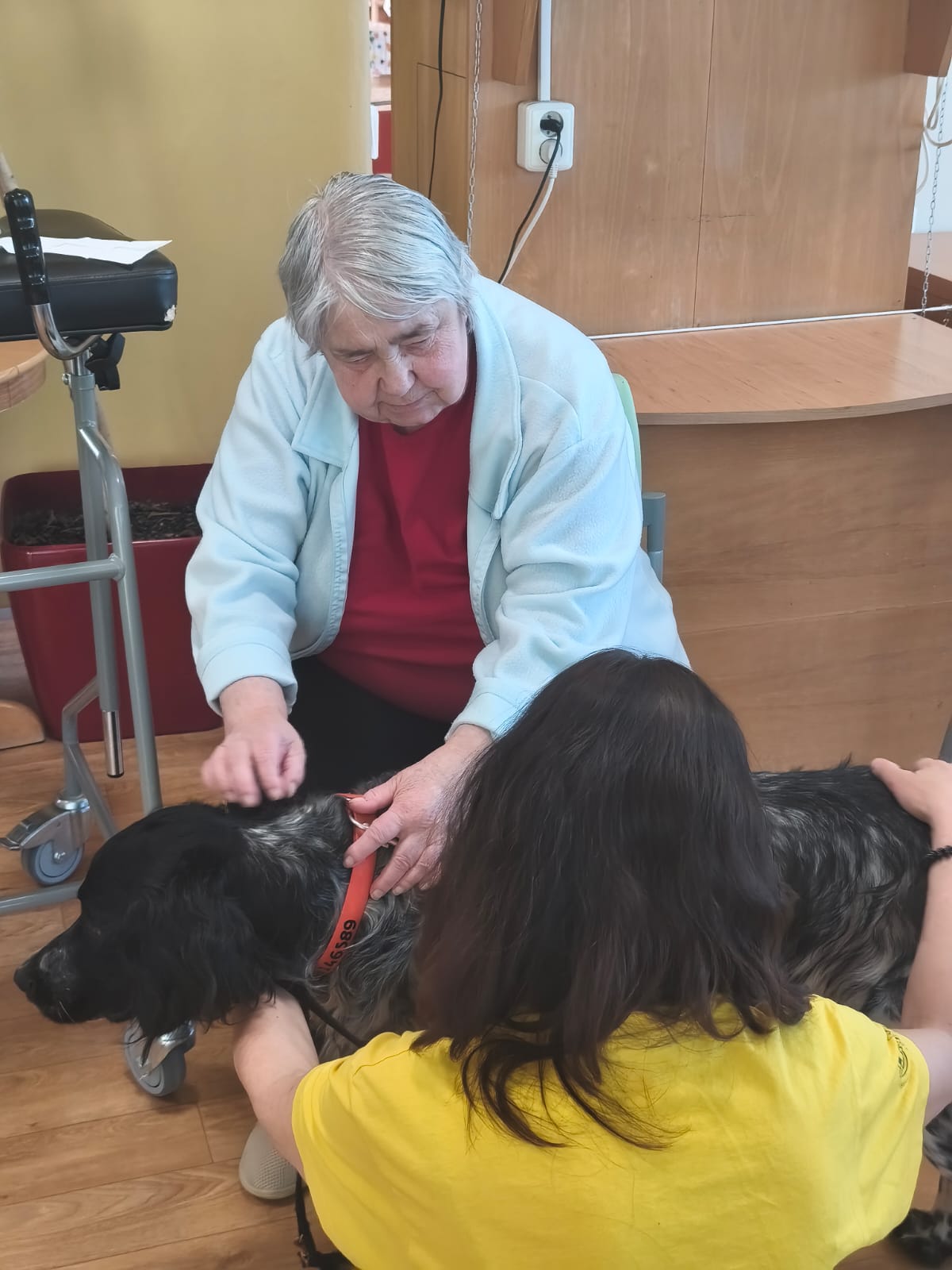 Dnešní dopoledne jsme se věnovali skupinové canisterapii, která proběhla v příjemné a klidné atmosféře. Klienti měli možnost navázat kontakt s terapeutickým pejskem Framem, plemene ohař. Mohli si ho pohladit, sledovat jeho reakce a s dopomocí jej také krmit. Přítomnost pejska přinášela radost, pocit zklidnění a podporovala pozitivní emoční naladění.