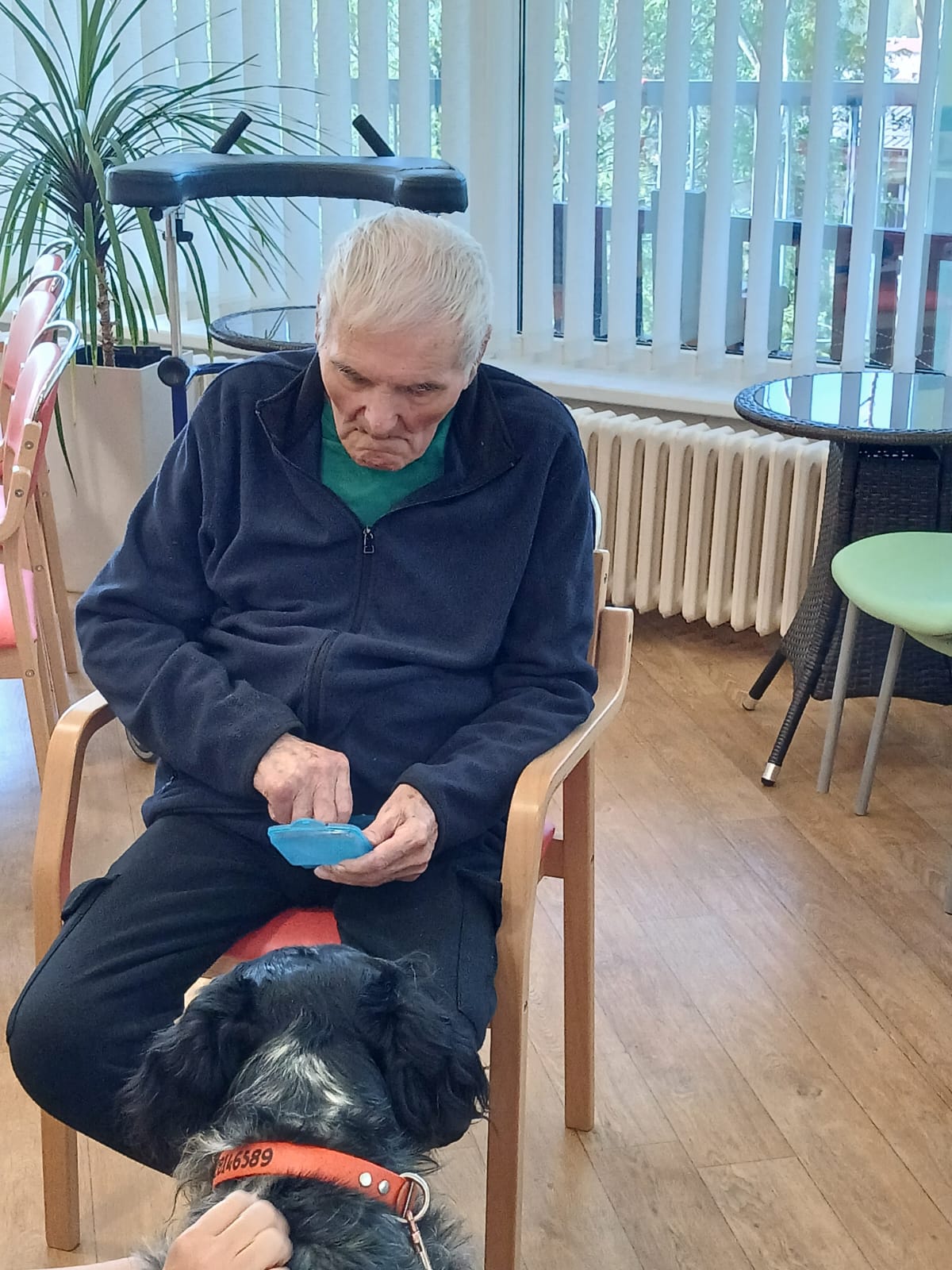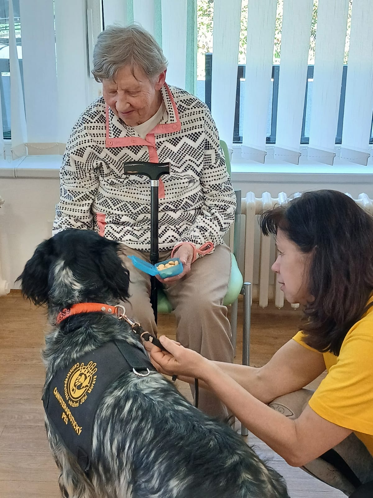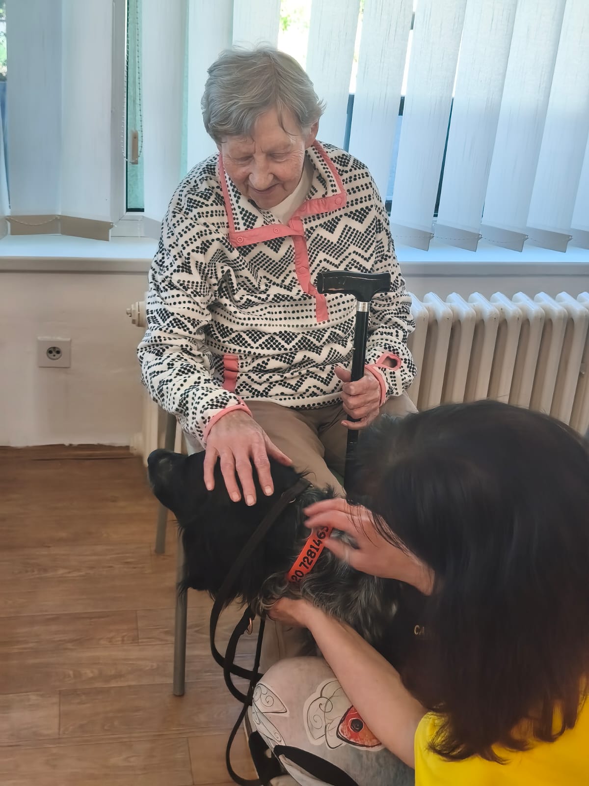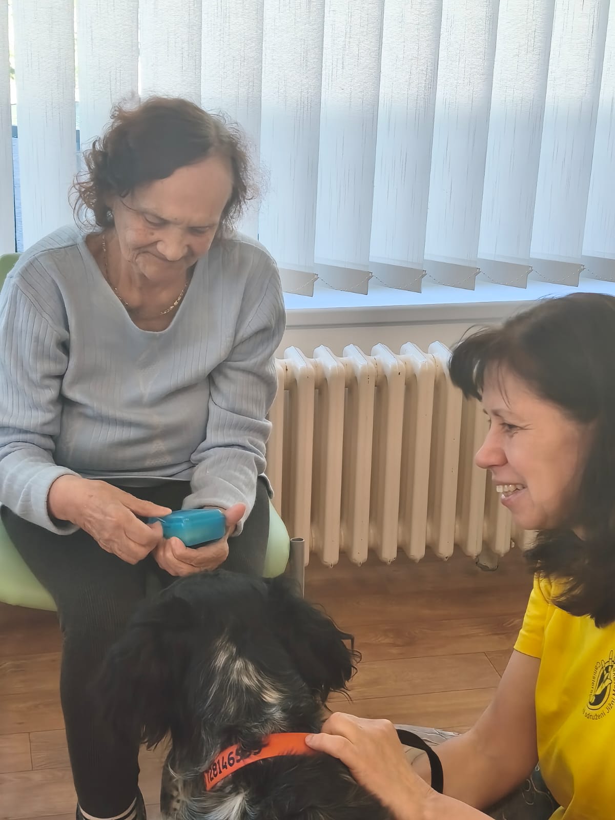 Dnešní dopoledne jsme se věnovali skupinové canisterapii, která proběhla v příjemné a klidné atmosféře. Klienti měli možnost navázat kontakt s terapeutickým pejskem Framem, plemene ohař. Mohli si ho pohladit, sledovat jeho reakce a s dopomocí jej také krmit. Přítomnost pejska přinášela radost, pocit zklidnění a podporovala pozitivní emoční naladění.