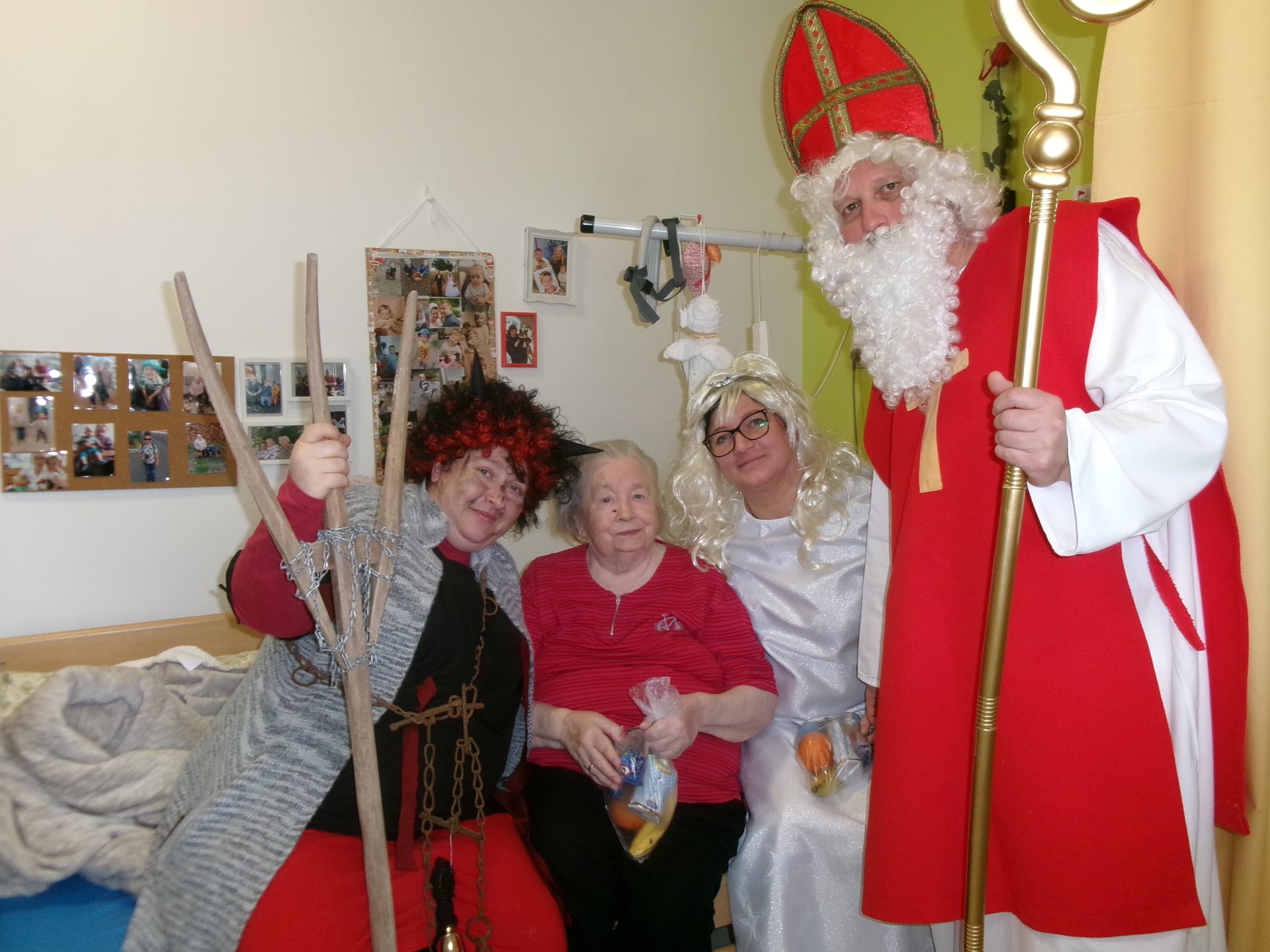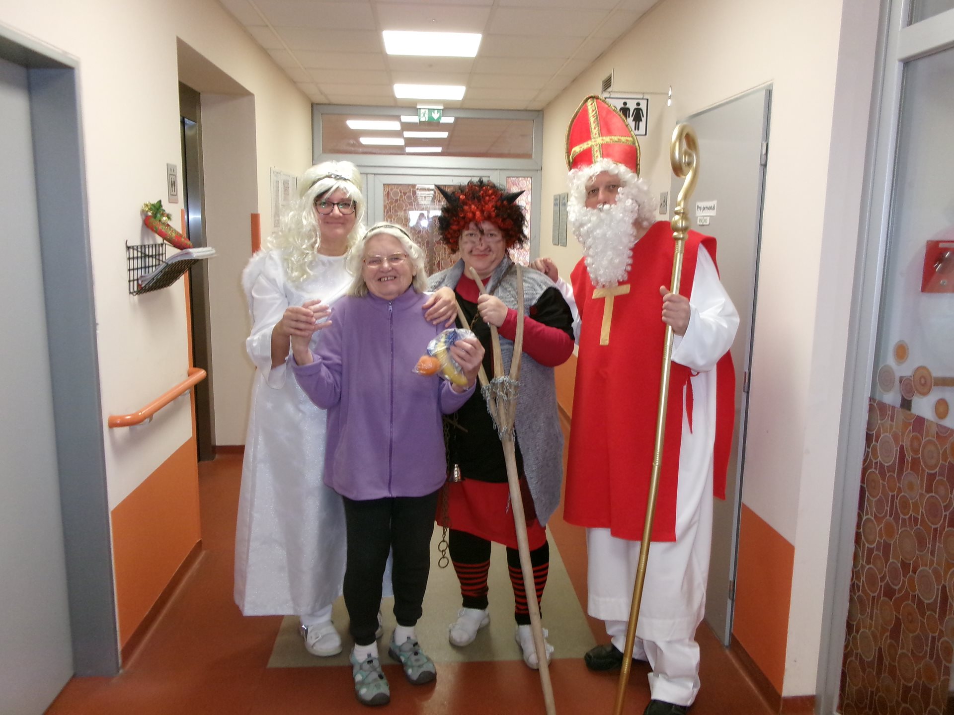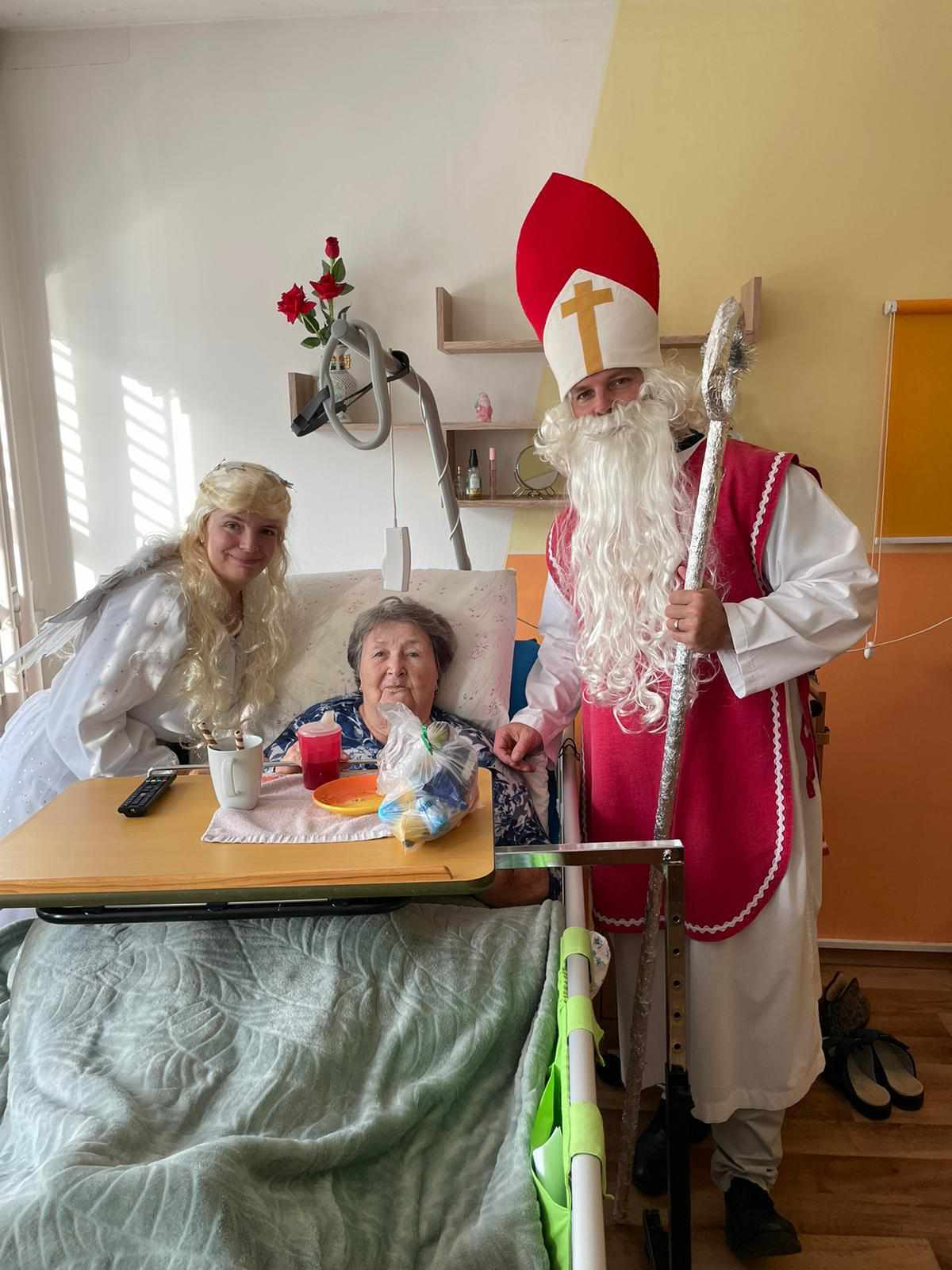 Nezapomnělo se ani na klienty, kteří zůstali na pokojích – Mikulášova družina je navštívila, popřála klidné svátky a předala malé pohoštění.