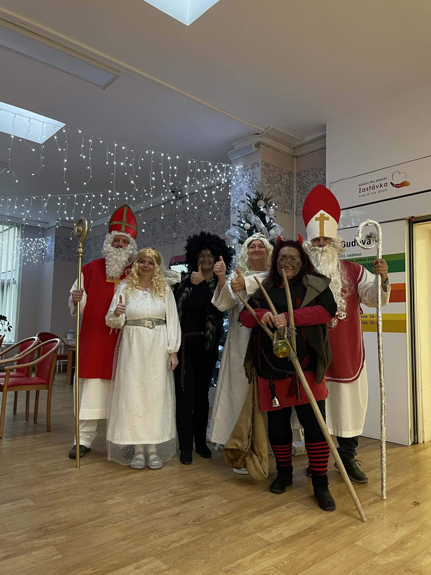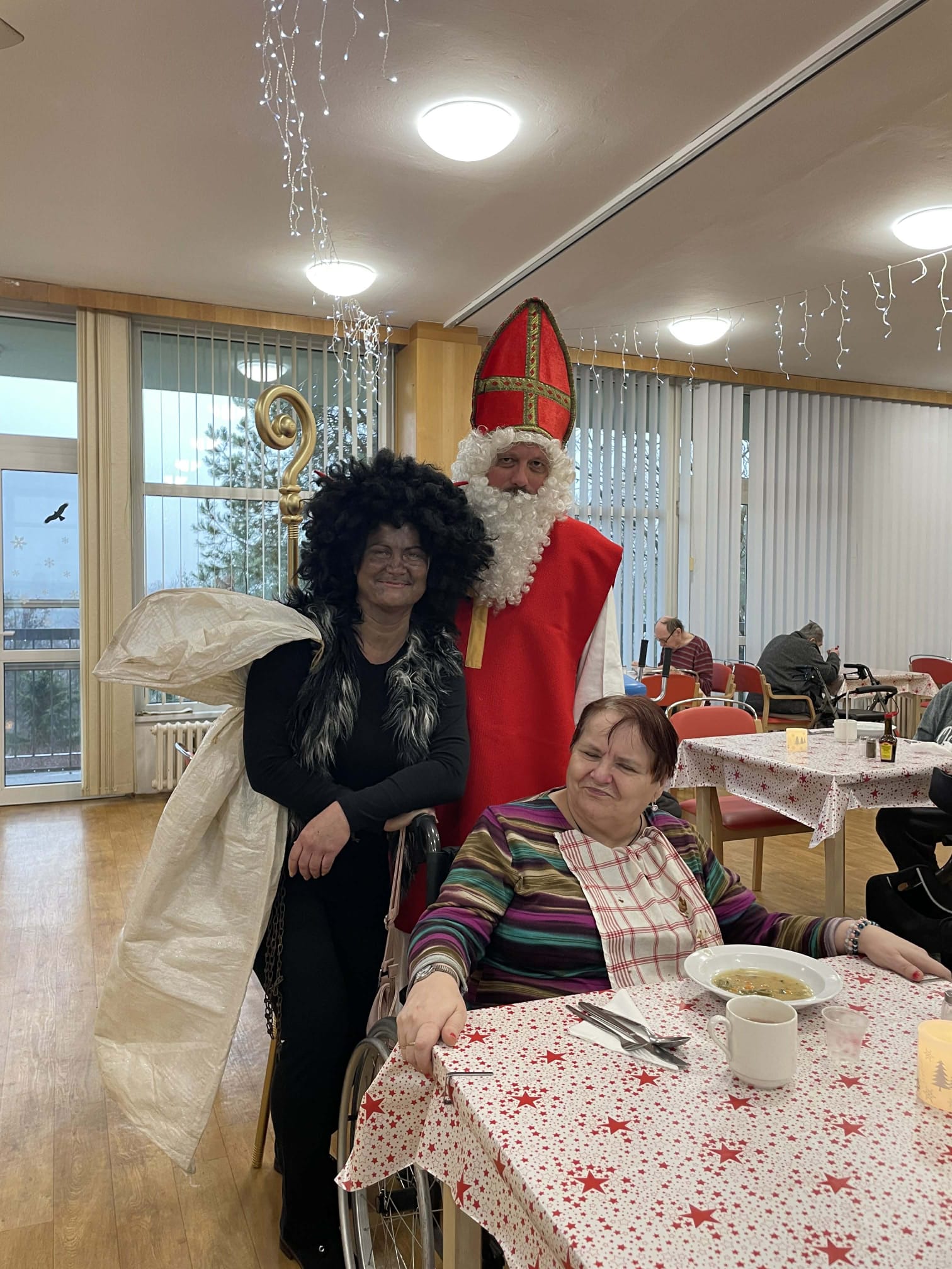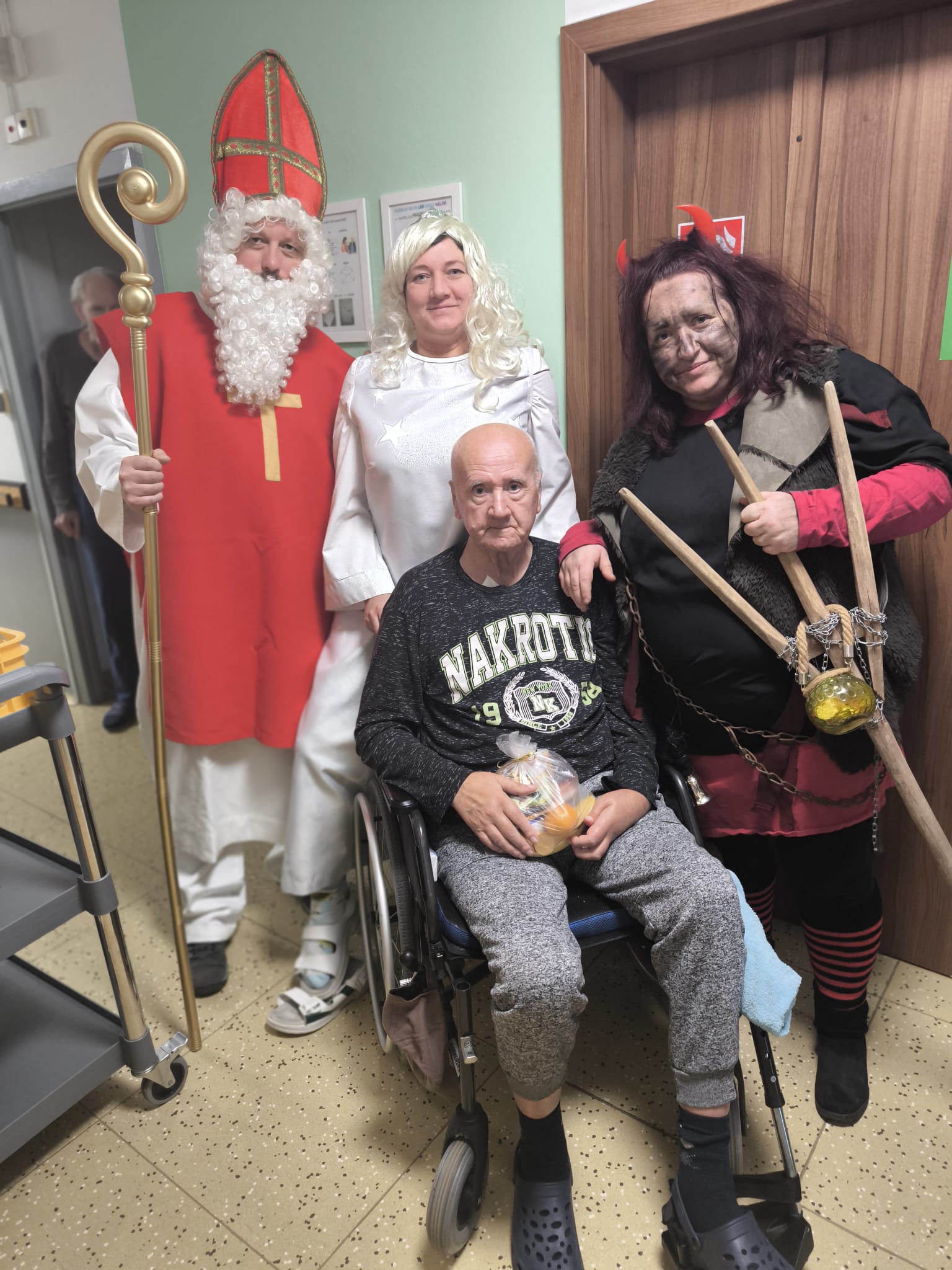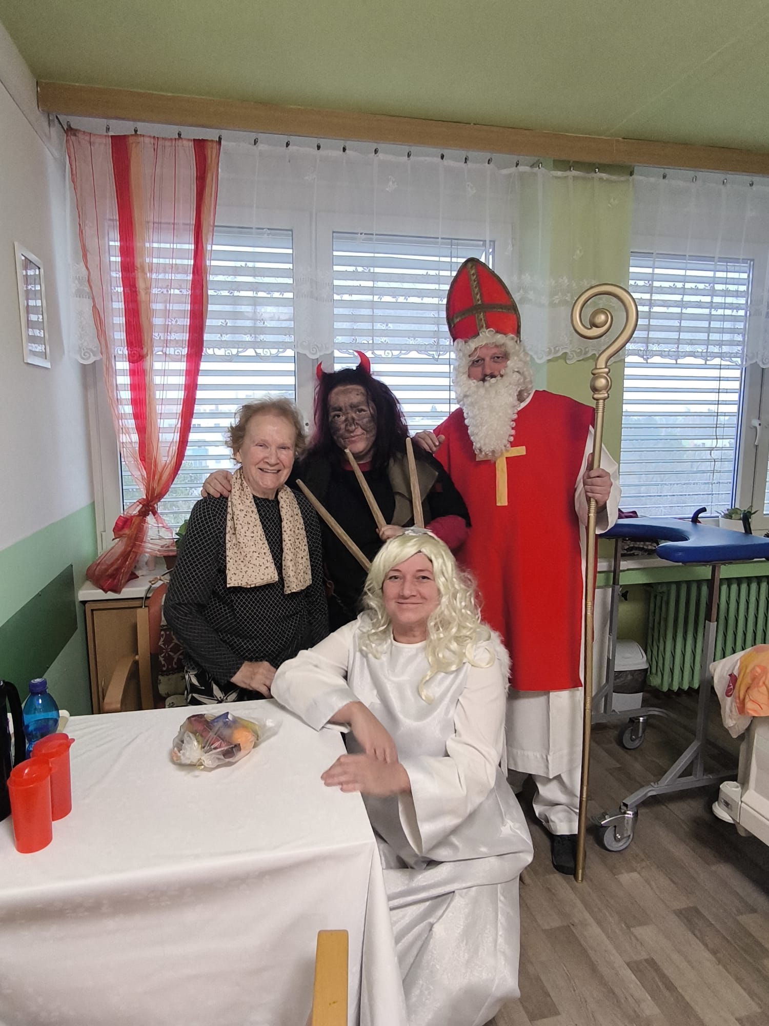 Dnešní den se v našem domově nesl v duchu krásné mikulášské tradice. Dopoledne mezi klienty zavítal Mikuláš, čert a anděl – v podání našich šikovných pracovníků, kteří každoročně přinášejí do domova sváteční atmosféru. Jejich příchod provázela veselá a slavnostní nálada, která rozzářila celý společenský sál.