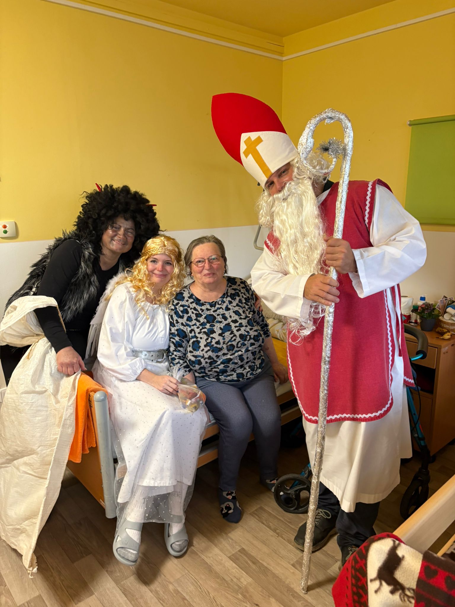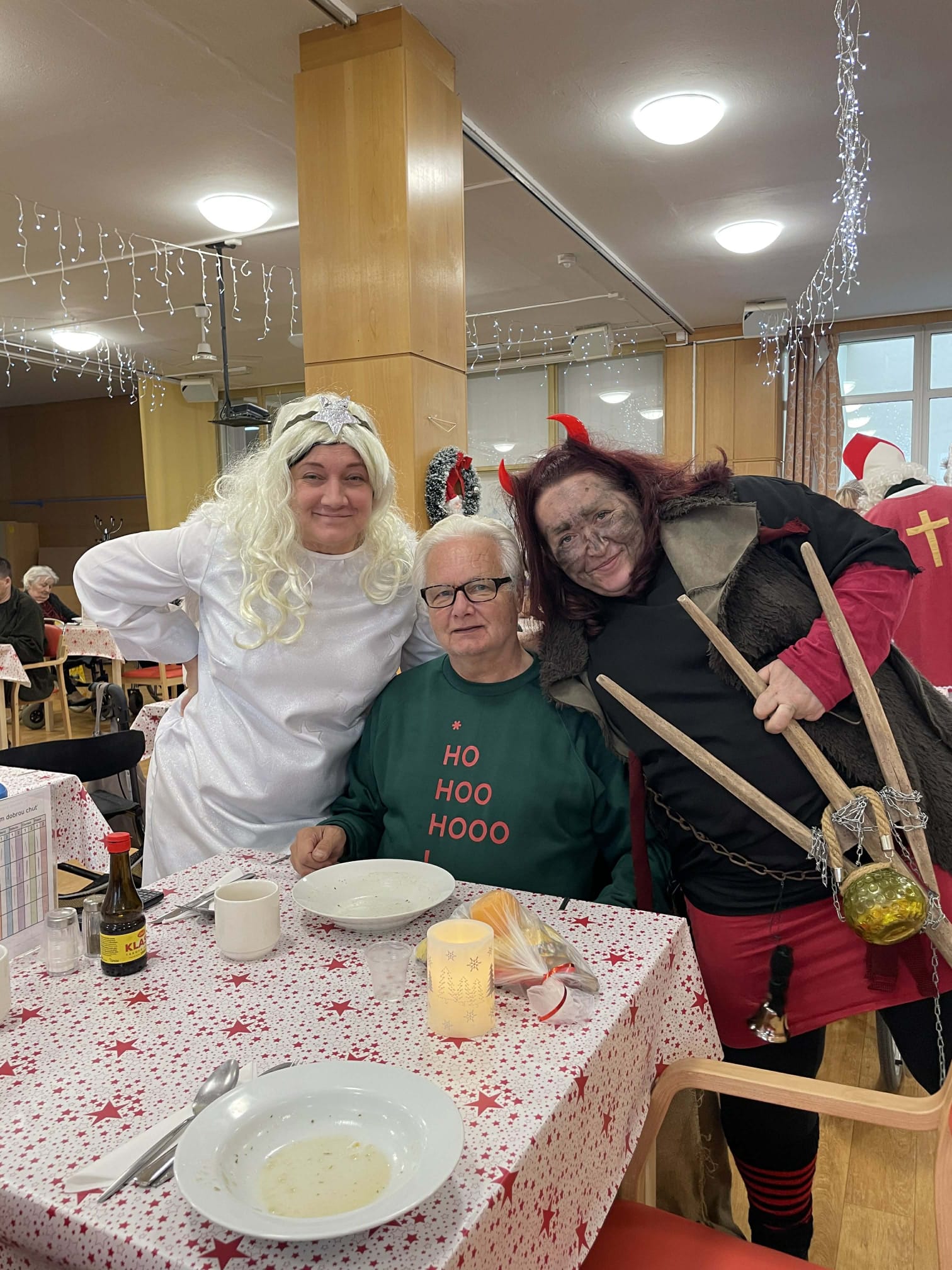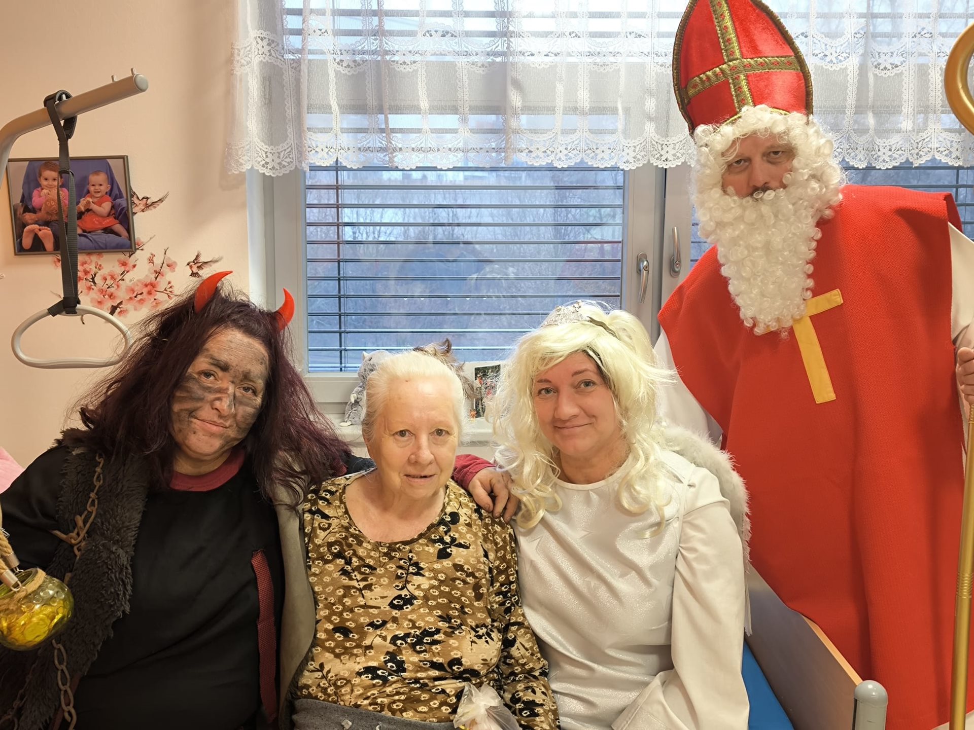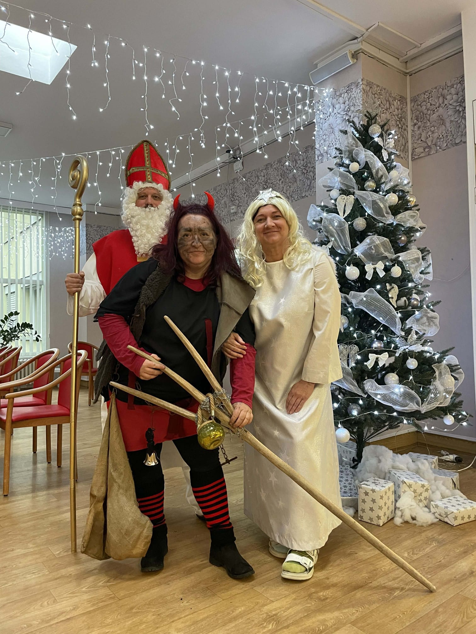 Dnešní den se v našem domově nesl v duchu krásné mikulášské tradice. Dopoledne mezi klienty zavítal Mikuláš, čert a anděl – v podání našich šikovných pracovníků, kteří každoročně přinášejí do domova sváteční atmosféru. Jejich příchod provázela veselá a slavnostní nálada, která rozzářila celý společenský sál.