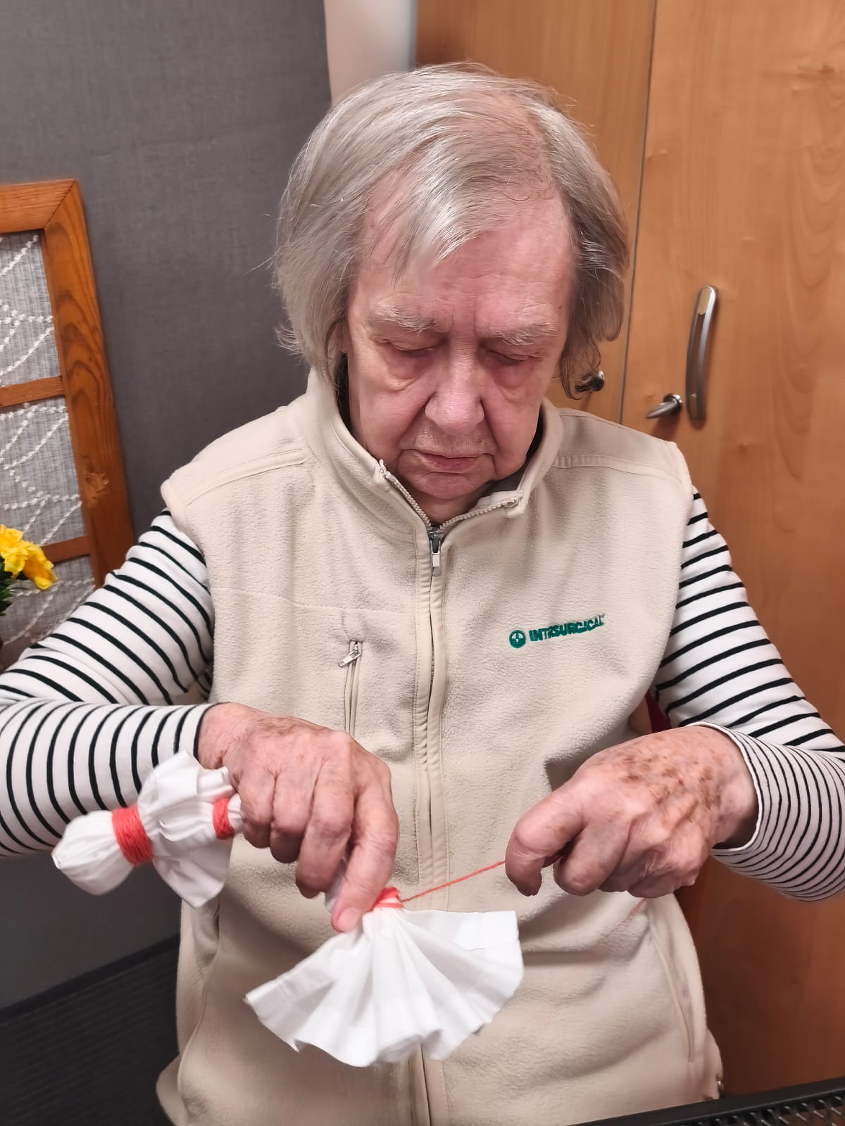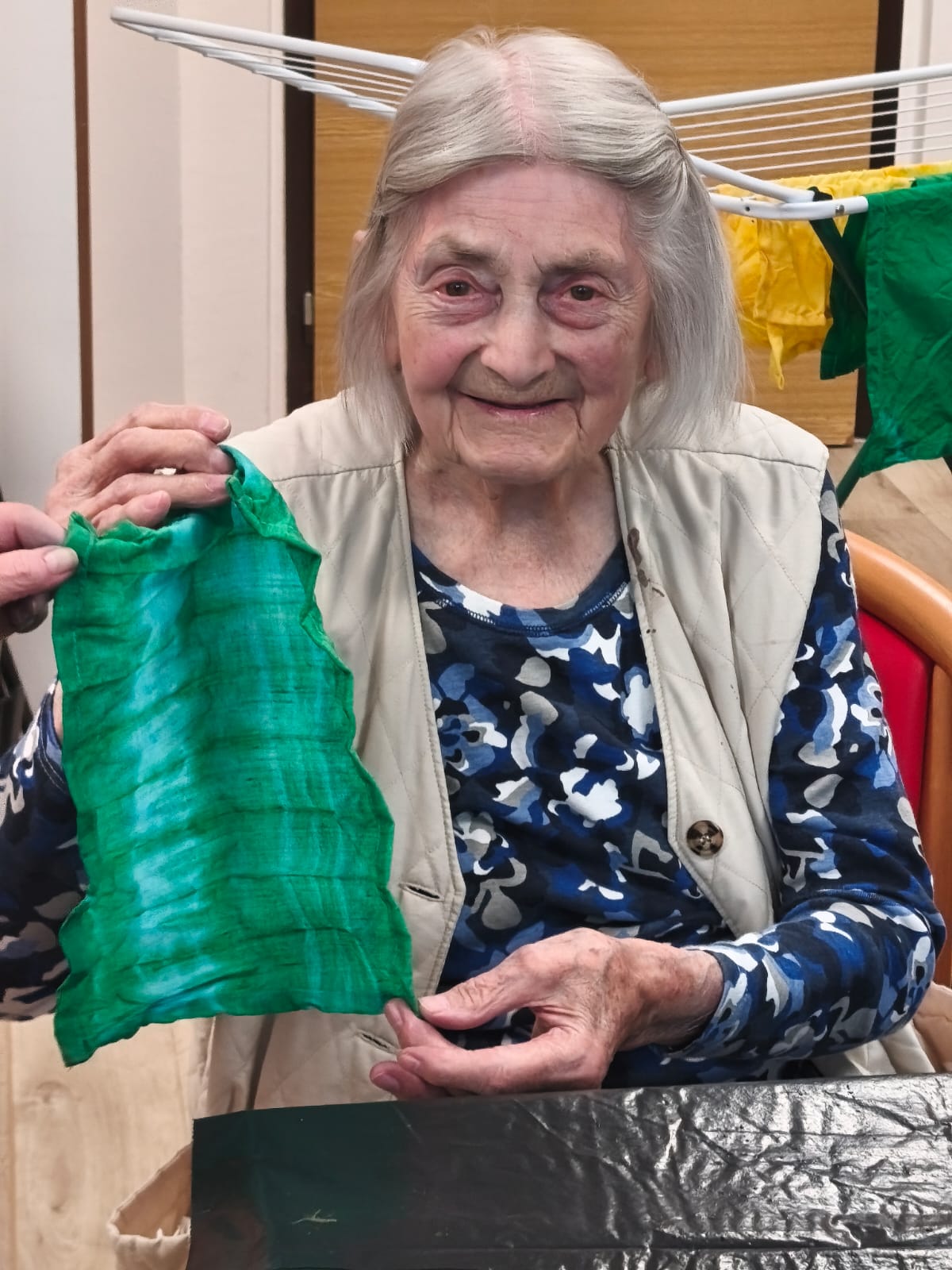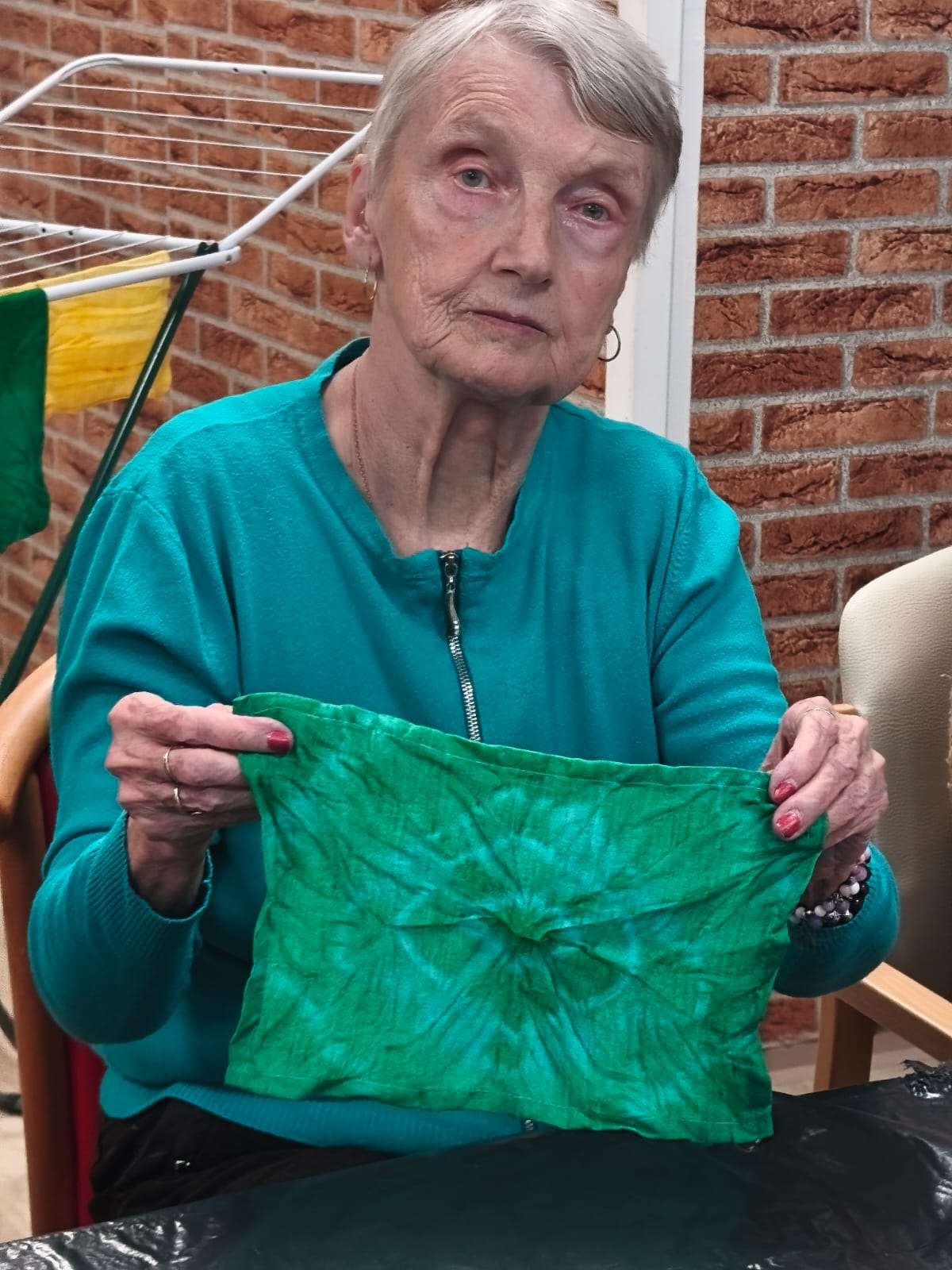 V našem domově jsme si zpestřili den tvořivou aktivitou – batikováním látkových ubrousků. Klienti pracovali s textilem, který skládali a omotávali provázkem, a následně s napětím očekávali, jaké vzory se po obarvení objeví.