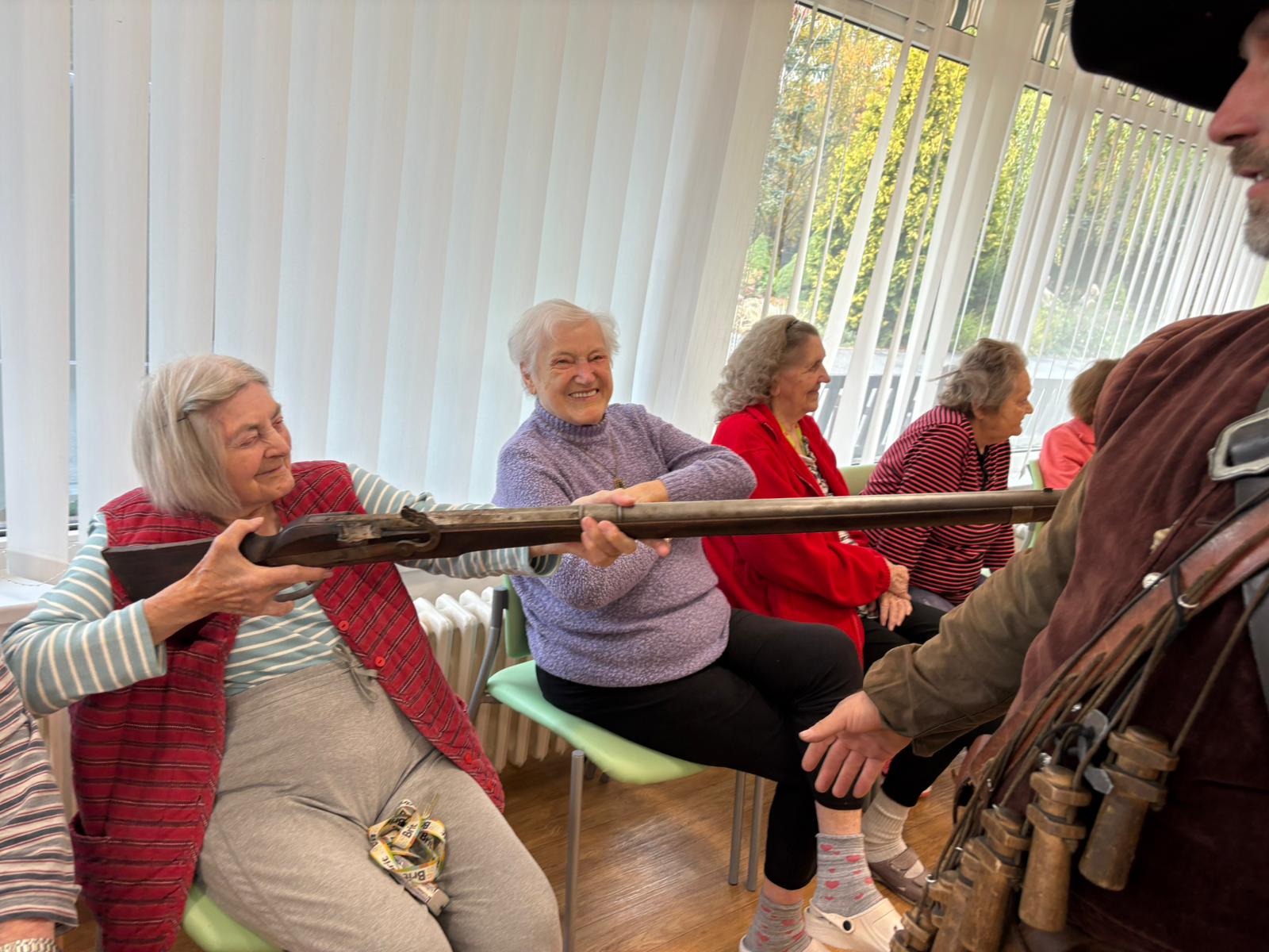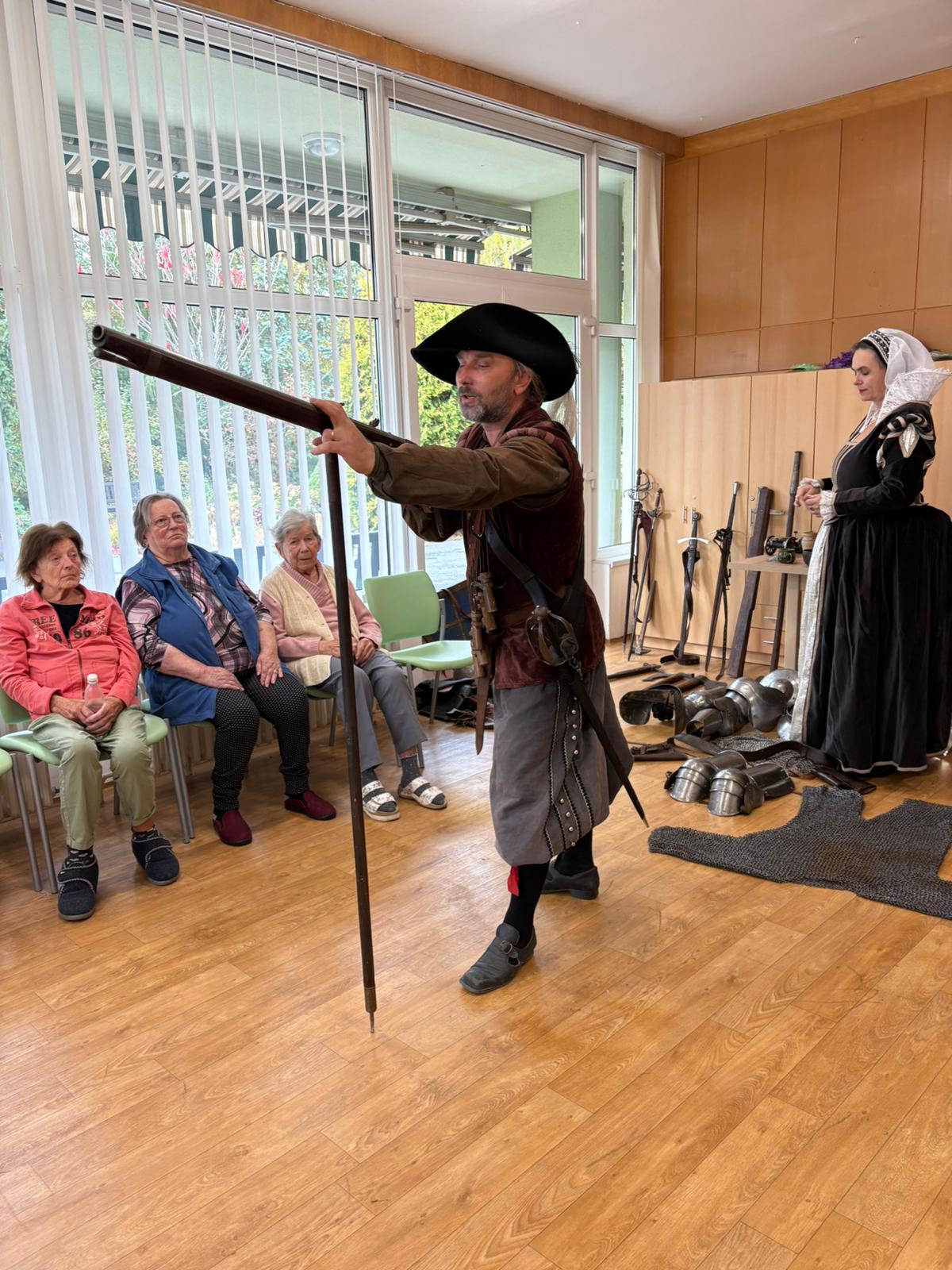 Včera nás navštívila skupina Adamant, která přivezla ukázku historických zbraní a nádherných dobových kostýmů. Naši senioři měli možnost si vše zblízka prohlédnout, poslechnout si zajímavé informace z historie a nasát jedinečnou atmosféru dávných časů.